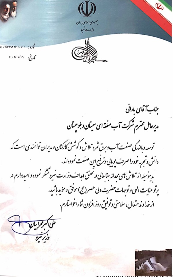 شرکت آب منطقهای برتر:○ محمد امین خندان بارانی، مدیرعامل شرکت آب منطقهای استان سیستان و بلوچستان○ سیاوش بدری، مدیرعامل شرکت آب منطقهای استان فارس○ عباس صدریانفر، مدیرعامل سازمان آب و برق خوزستان (اربعین)